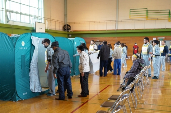 7月30日に発令された津波警報による対応で見えた課題を踏まえ、11月22日に虻田地区で津波防災訓練を実施しました。町民や町職員約200人が参加し、津波警報発令から避難所への移動までの一連の流れを確認しました。避難所で段ボールベッドやパーテーションの設営体験を行ったほか、町公式LINEを活用した情報発信などに取り組みました。